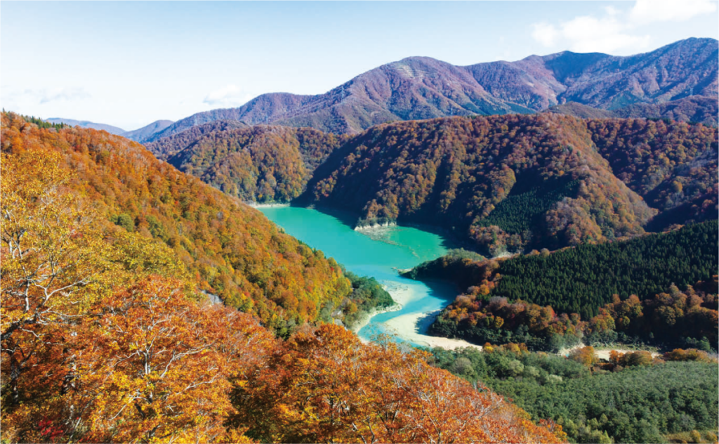 見どころのひとつが、エメラルドグリーンに輝く「田代湖」。紅葉に囲まれた湖面の鮮やかなコントラストは圧巻で、訪れる人を魅了します♪特に紅葉シーズンは「日本一の紅葉空中散歩」と称されるほど人気が高く、眼下に広がる渓谷美や湖を彩る景観は写真映えも抜群です♪